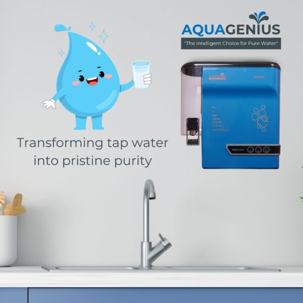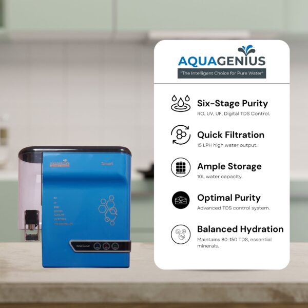 AQUAGENIUS – Smart LED RO Water Purifier – RO + UV + Zinc Copper Alkaline + TDS Controller | 15 LPH Output | 10L Storage – Blue