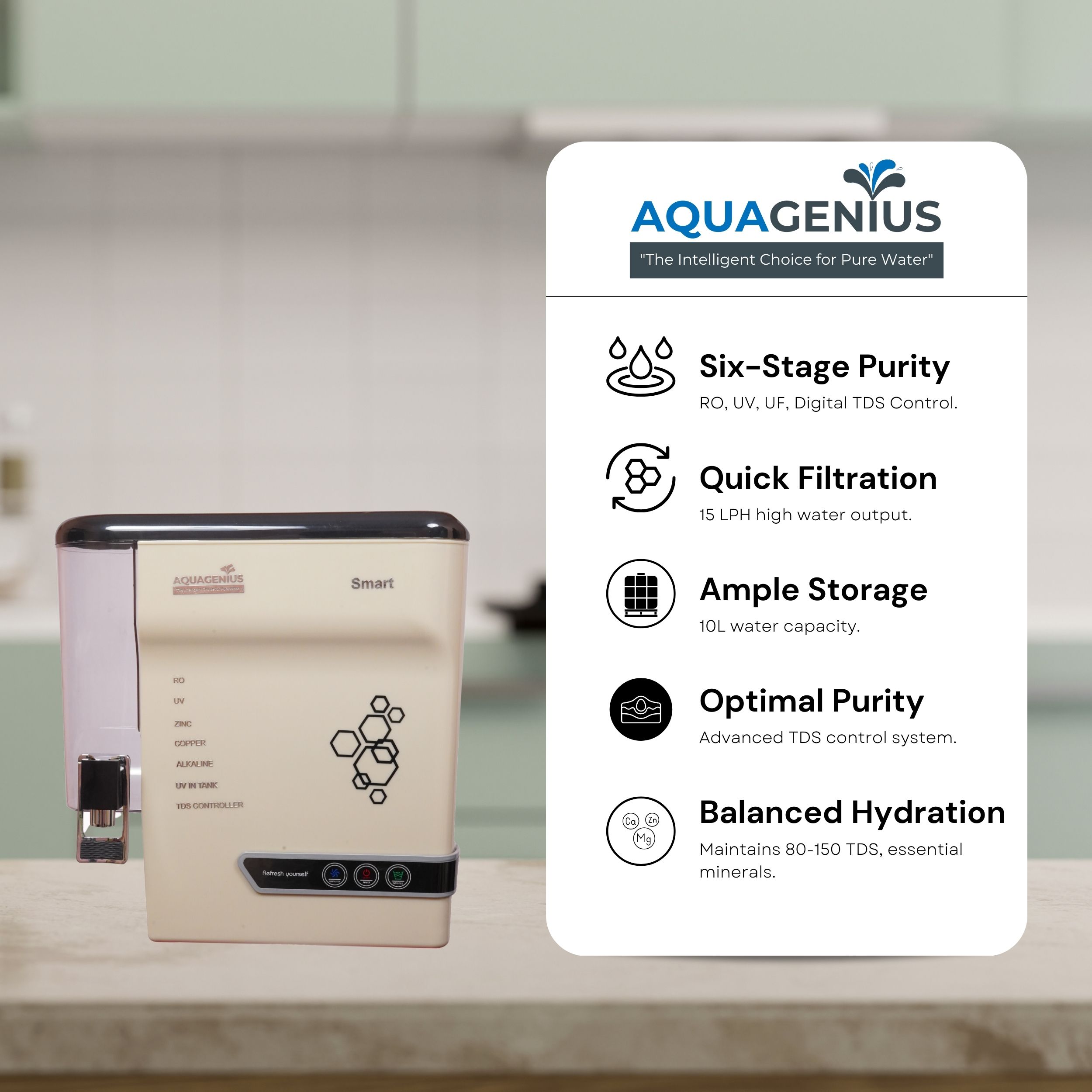 AQUAGENIUS – Smart LED RO Water Purifier – RO + UV + Zinc Copper Alkaline + TDS Controller | 15 LPH Output | 10L Storage – Gold