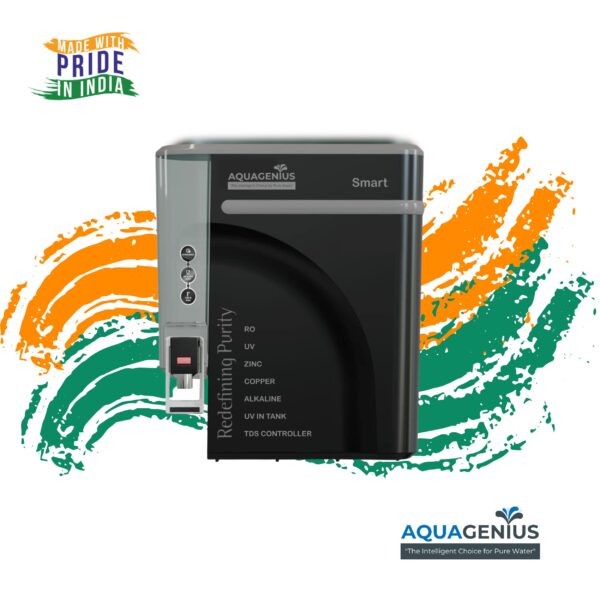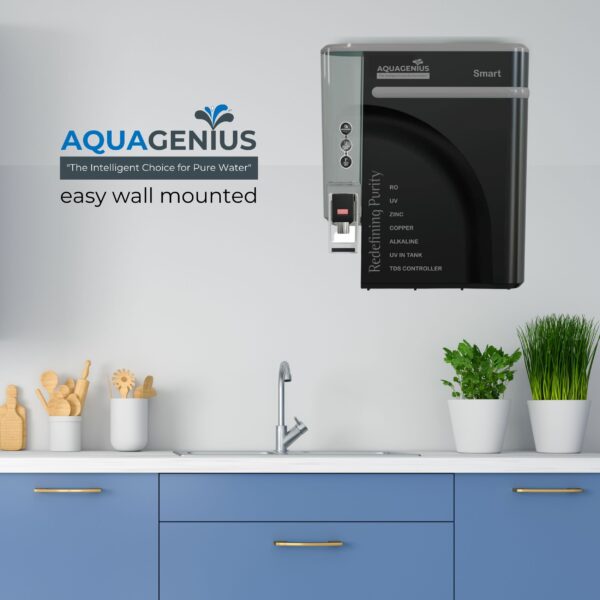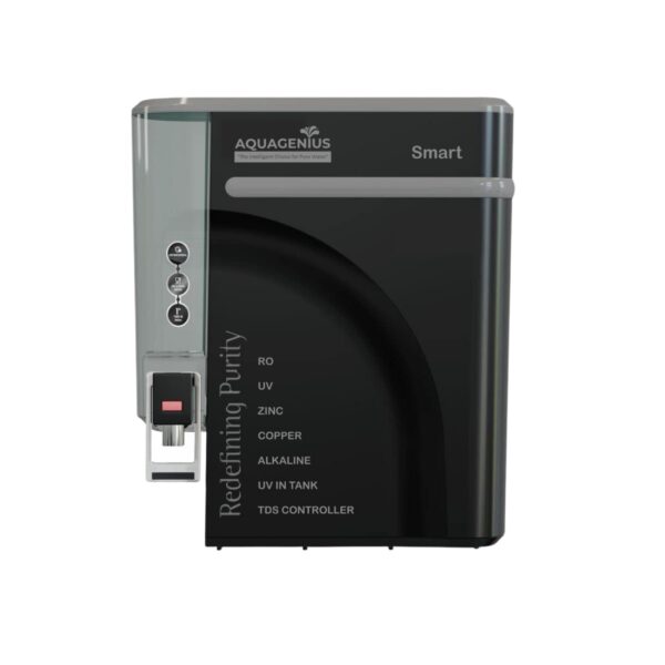 AQUAGENIUS – Smart RO Water Purifier – RO + UV + Zinc Copper Alkaline + TDS Controller | 15 LPH Output | 10L Storage – Black