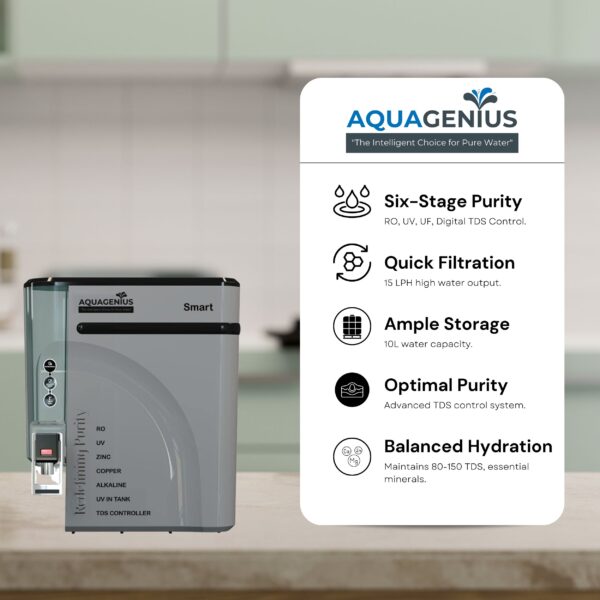AQUAGENIUS – Smart RO Water Purifier – RO + UV + Zinc Copper Alkaline + TDS Controller | 15 LPH Output | 10L Storage – Grey