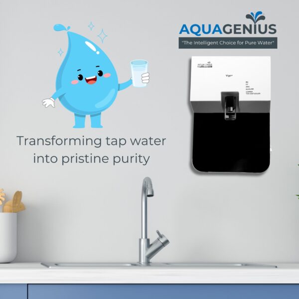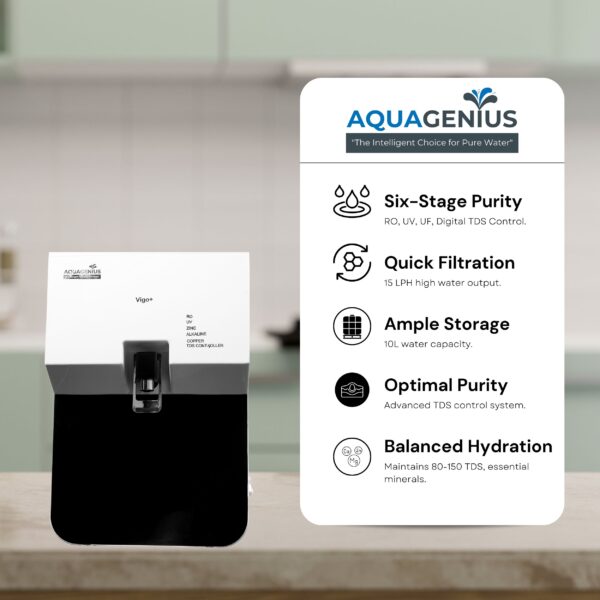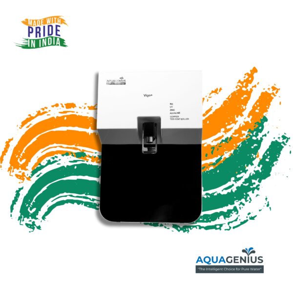 AQUAGENIUS – Vigo + RO Water Purifier – RO + UV + Zinc Copper Alkaline + TDS Controllerler | 15 LPH Output | 10L Storage – White & Black